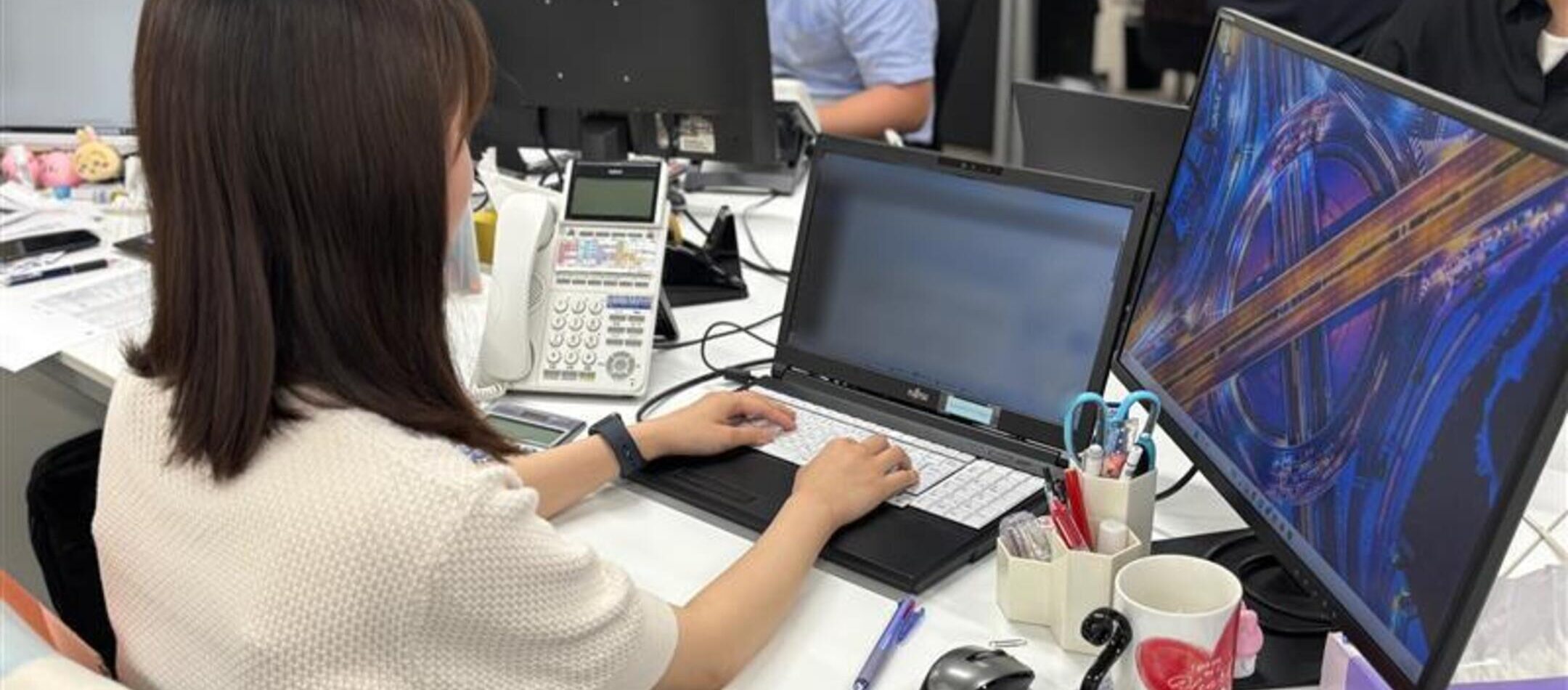 経理と総務を兼任しています。経理は月次集計業務や売掛金の入金照合、営業からまわってくる請求書の確認。総務はパソコンや複合機の不具合時の対応、ホームページのブログアップ、来社される業者対応などを幅広く行っています。